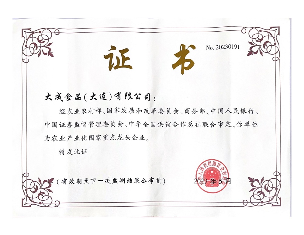 4. 于2005年获中国农业部评选为「农业产业化国家重点龙头企业」