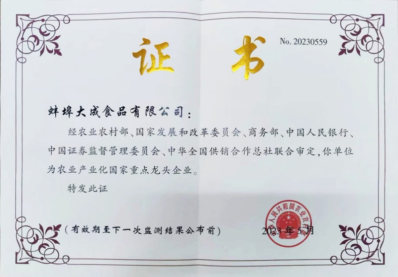 3. 于2013年荣获中国农业部颁发「农业产业化国家重点龙头企业」称号