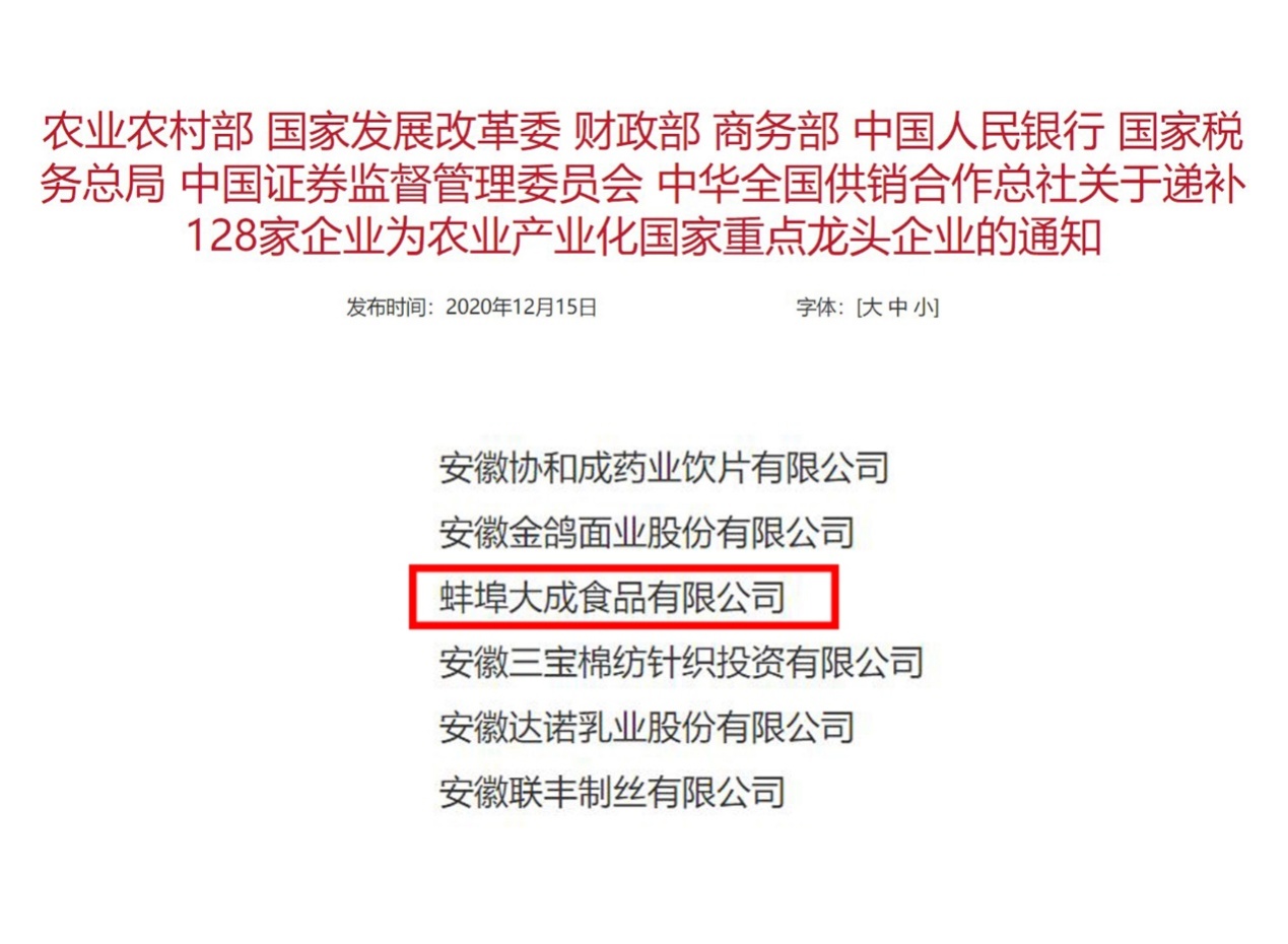 2020年12月15日,农业农村部等8部委发布关于递补128家企业为农业产业化国家重点龙头企业的通知,蚌埠大成食品有限公司被评选为全国重点龙头企业,是蚌埠市唯一的一家递补入选的企业,是全国1248家农业产业化国家重点龙头企业之一,更是全国4000多万家企业之一。十二年的栉风沐雨,十二年的厚积薄发,十二年的砥砺前行,蚌埠大成突出重围!