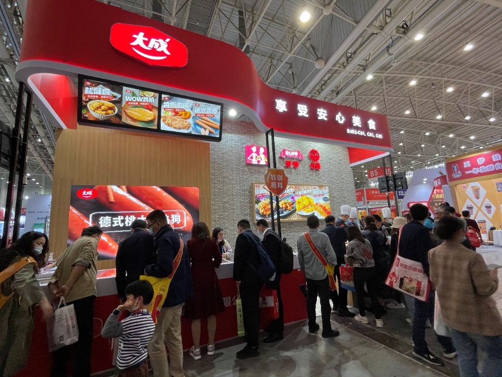 在后疫情时代,家庭食材的消费市场蓬勃发展,借此展会契机,大成将畅销的家庭装产品集中亮相展示,包括缤纷小食、台湾美食、火锅豆捞、轻食简餐、快手大厨等多个系列,非常契合家庭食材消费、社交电商的选品需求。开幕式当天,展位便吸引了众多的参展商及观众参观咨询。同时展会组委会也授权大成食品作为特别推荐展商,助力展位热度提升。