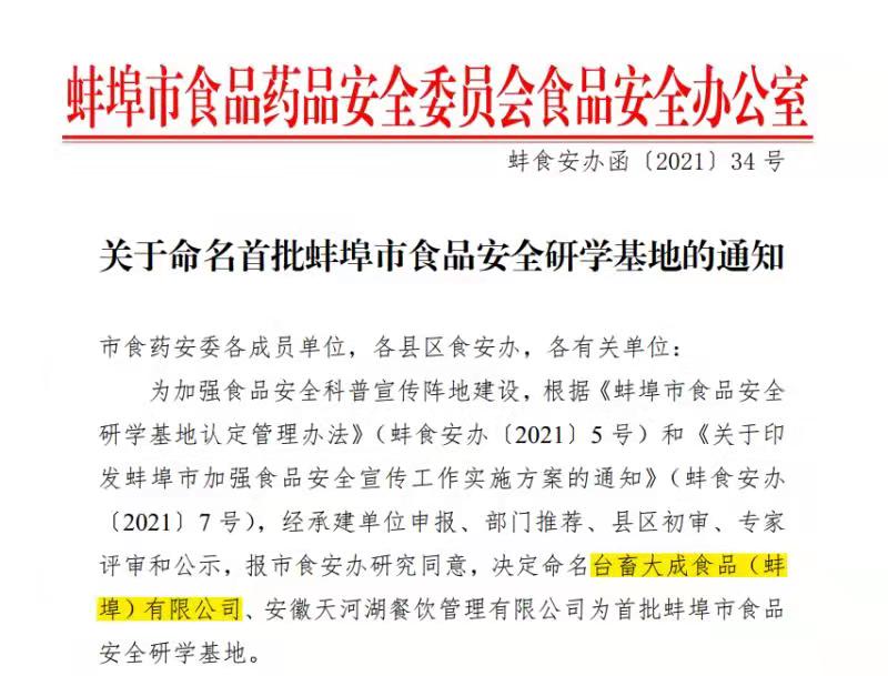 台畜大成通过蚌埠市举办食品安全研学基地申请