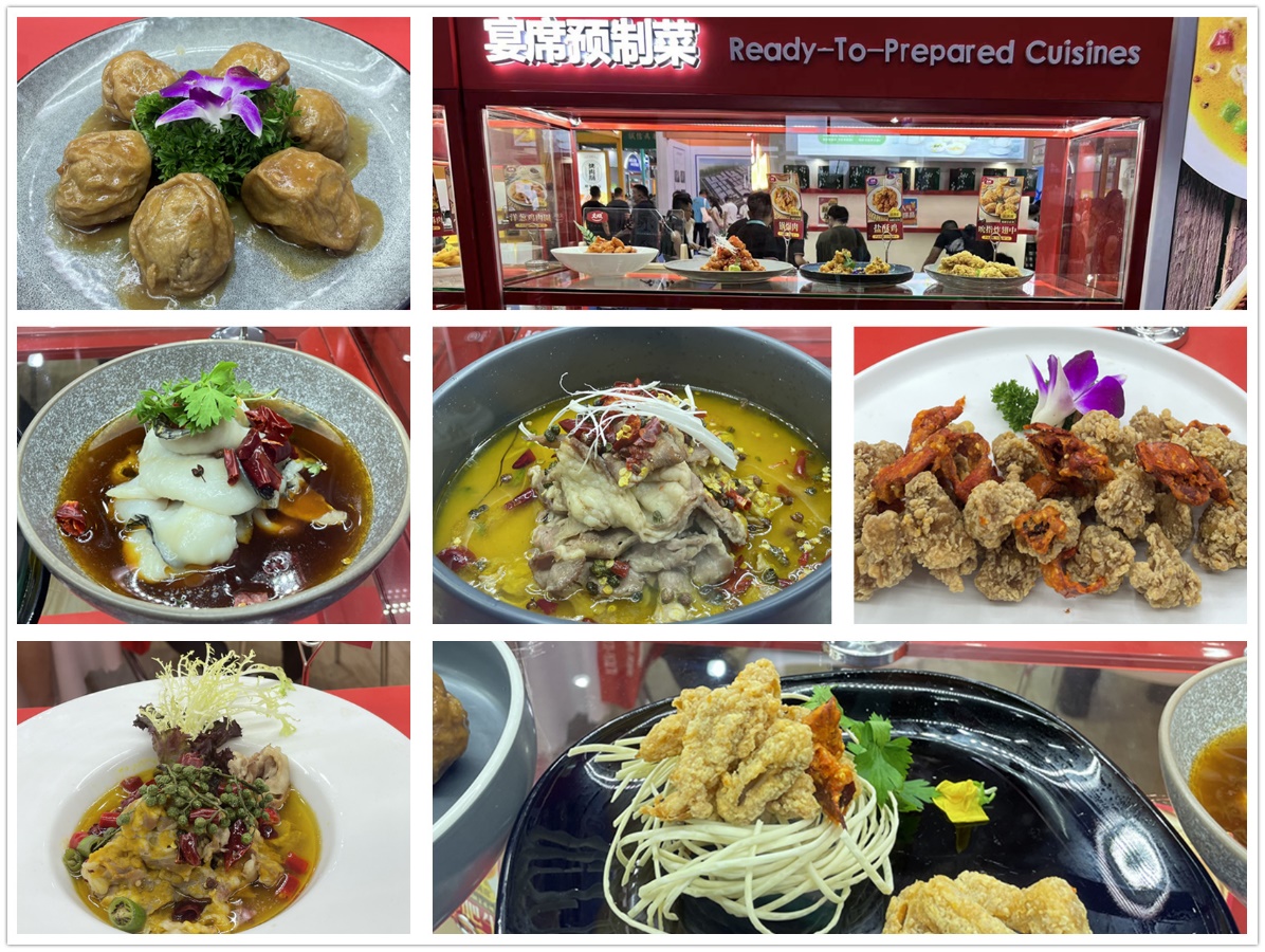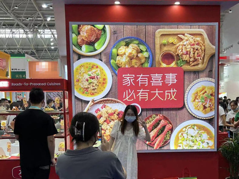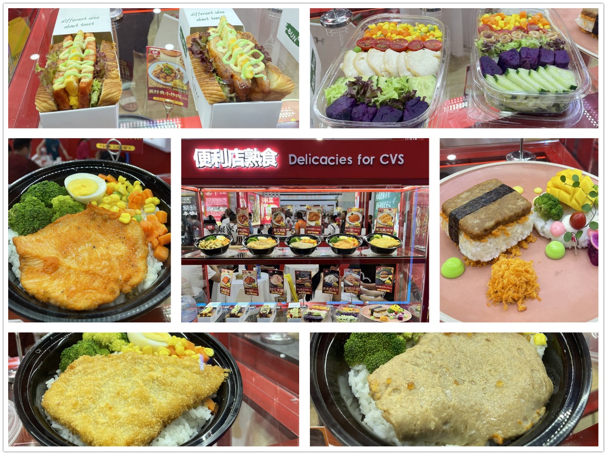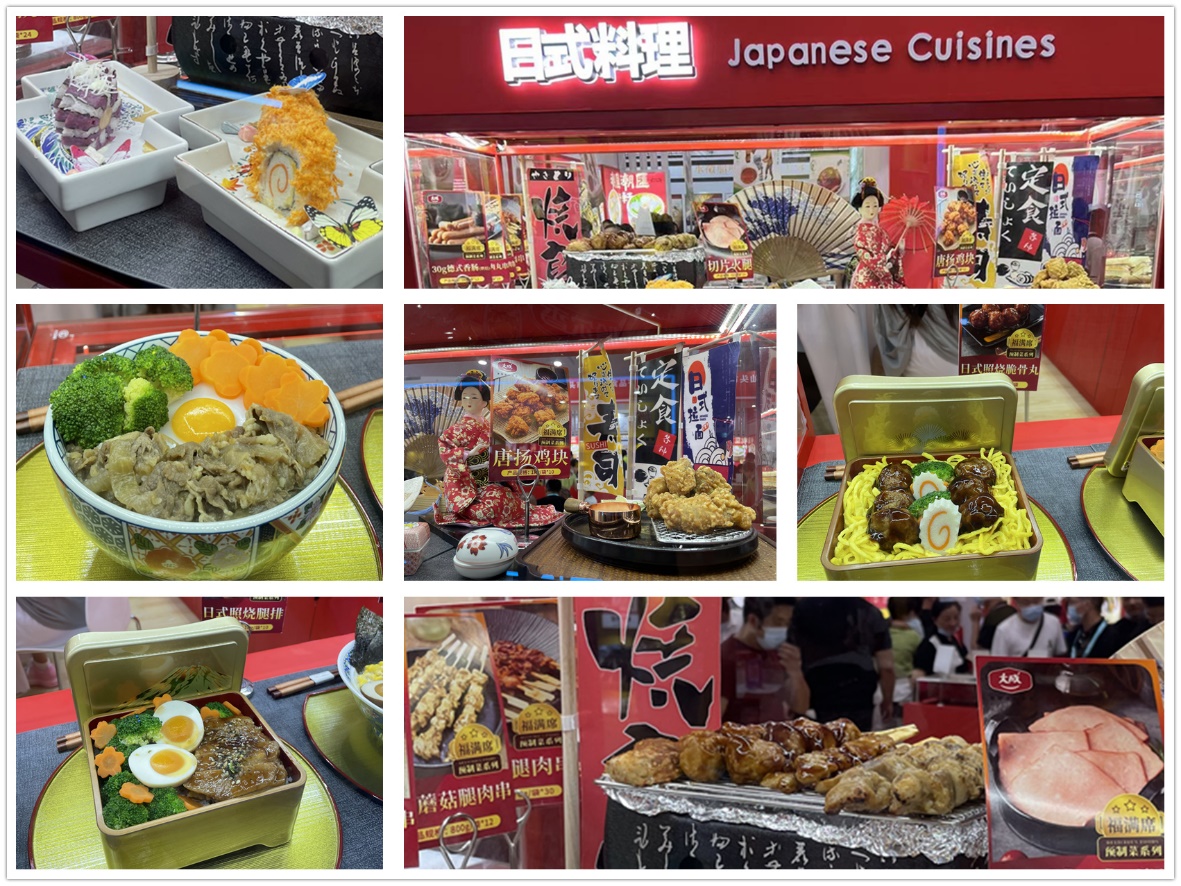 展位上,根据产品售卖管道的不同,进行了对应的餐单菜品展示,例如:休闲餐饮、团膳美食、宴席预制菜等,更有当前流行的日式料理、便利店熟食。同时也将热销的家庭装产品逐一展示。