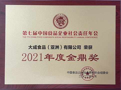大成食品(亚洲)有限公司于第七届中国食品企业社会责任年会荣获“2021年度金鼎奖”