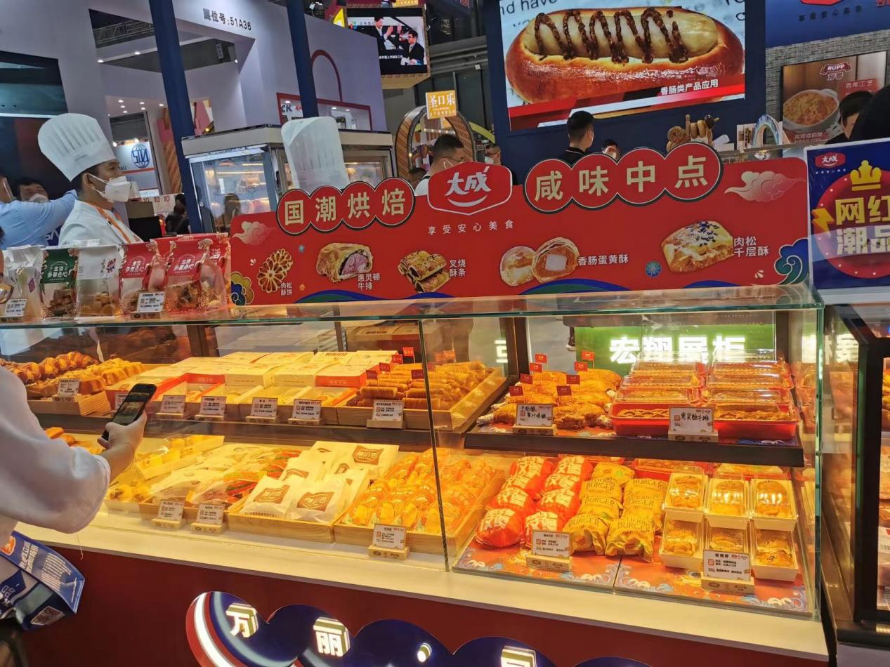 “国潮烘焙 咸味中点”展区产品款式展示,每款产品呈现“国潮”“新中式”新方向
