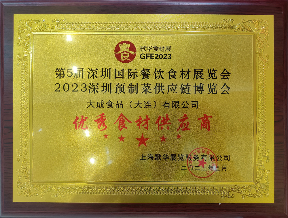 本届展会特举办“2023年度优秀食材供应商”评选活动,大成食品(大连)有限公司作为参展商也参加了此次评选,凭借产品优势及影响力,最终通过线上投票形式成功入选前十家企业,被评选为“2023年度优秀食材供应商”。