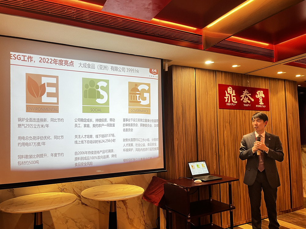 图:主席特助韩芳祖简报大成集团ESG工作进展。2022畜牧行业《ESG 绩效榜单暨管理提升手册》绩效表现,大成食品名列前茅;在透明度评分,大成食品为第一梯队最高分。