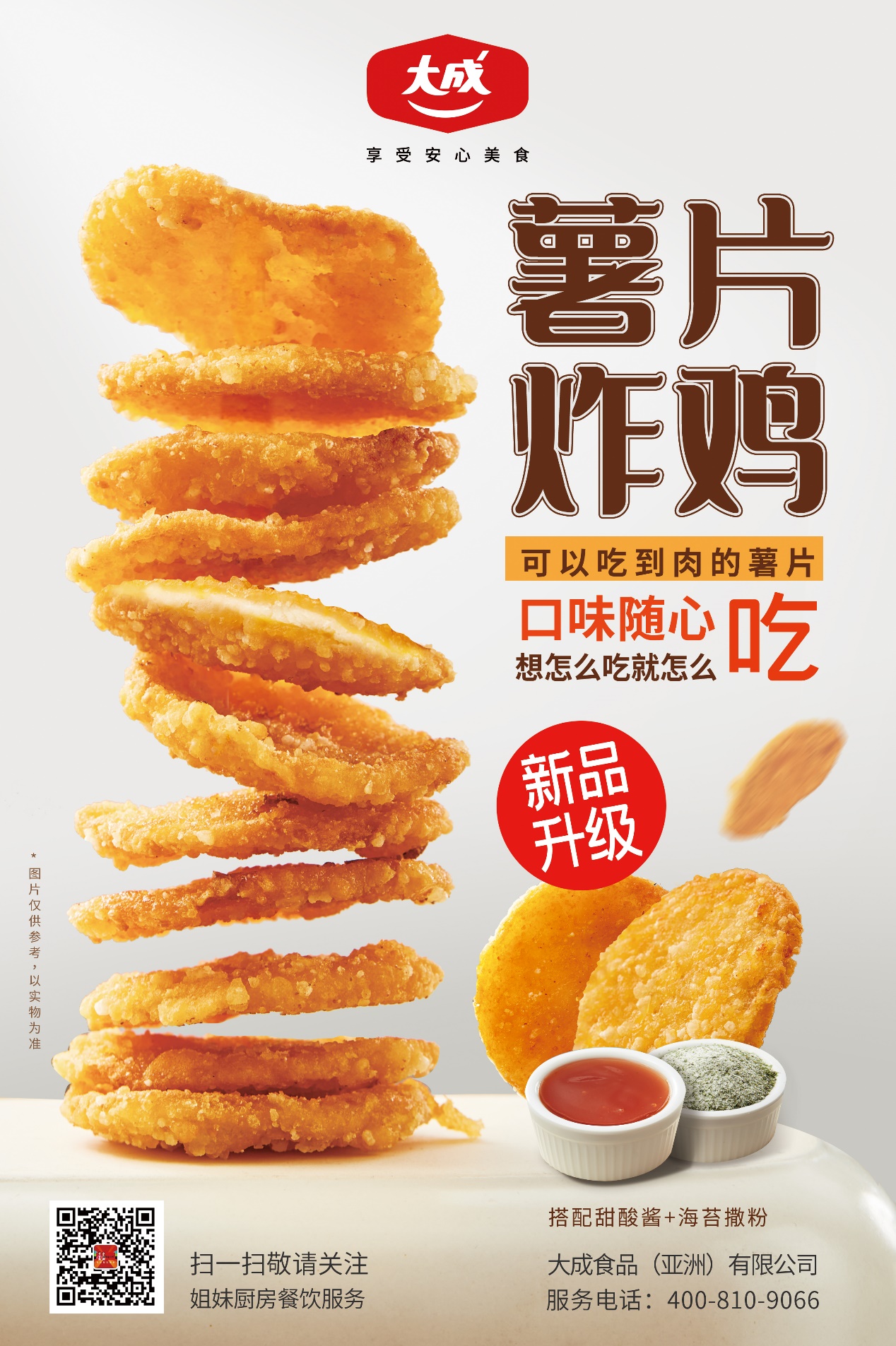大成食品致力于肉制食品加工炸/卤/烤/微波烹调核心技术,提供专业餐饮及零售客户最佳餐单解决方案,并进一步成为最安心的肉制食品消费品牌。大成薯片炸鸡荣获ISEE全球食品创新奖、黑椒牛肉馅荣获中国国际焙烤展创新产品奖,甜嫩鸡卷荣获华糖万商领袖大会年度爆款奖等。