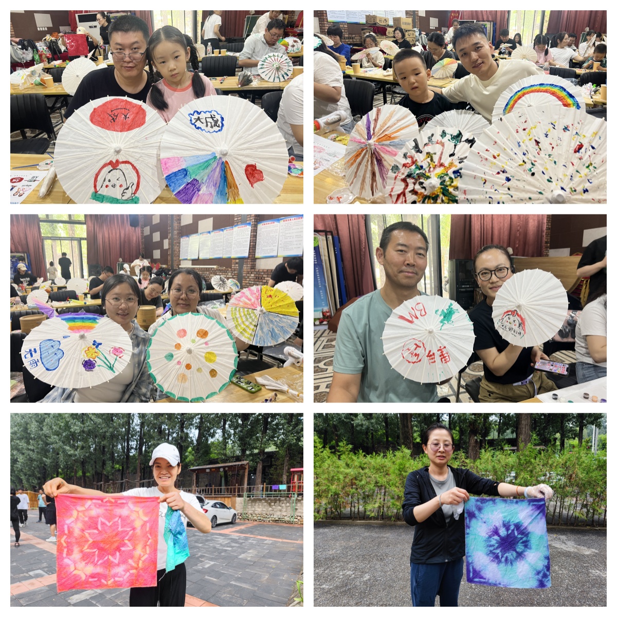 午后,非遗手工活动油纸伞绘制与扎染技艺体验,激发了大家的无限创意与想象力,每一幅作品都独一无二,满载着家庭的温馨与爱意。自由活动时间里,小溪边的捞鱼与滋水枪大战,更是让孩子们尽情释放天性,享受童年的欢乐。