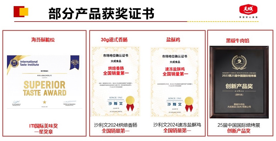 近年,大成食品在烘焙、餐饮、零售、鲜食等多个领域皆创下傲人成绩,旗下产品获得国内外业内多项大奖荣誉。<大成 盐酥鸡>拿下弗若斯特沙利文2024速冻盐酥鸡全国销量第一,更入选2024福布斯中国大消费年度影响力产品;<大成 30g德式香肠>除夺得弗若斯特沙利文2024烘焙香肠全国销量第一之外,还获由布鲁塞尔国际风味评鉴所颁发的ITI国际美味奖二星奖章之殊荣;产品除受到业内专业人士的肯定,更重要的是得到消费大众的认可、信任与喜爱。其他还有isee全球食品创新奖、isee全球美味奖、isee创新品牌百强榜、第25届中国国际焙烤展创新产品奖。大成食品旗下产品常常出现在这些榜单上,验证了大成食品在业界的产品竞争力与市场地位。