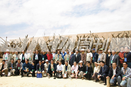 2004年阿拉善SEE生态协会成立,企业家们在内蒙古阿拉善月亮墙忏悔墙前合影