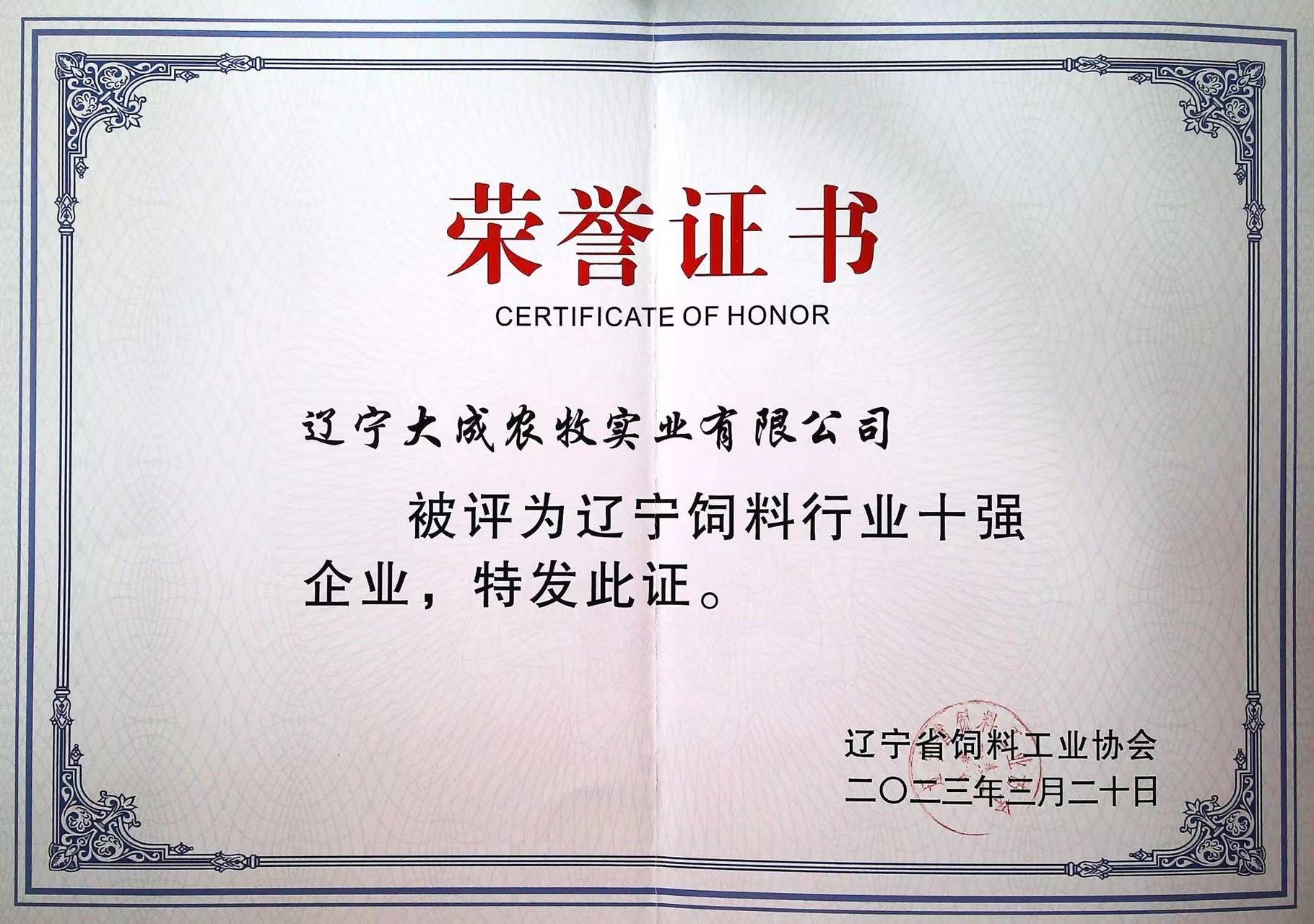 3. 於2009年獲中國飼料工業協會頒發「全國五十強飼料企業」稱號
