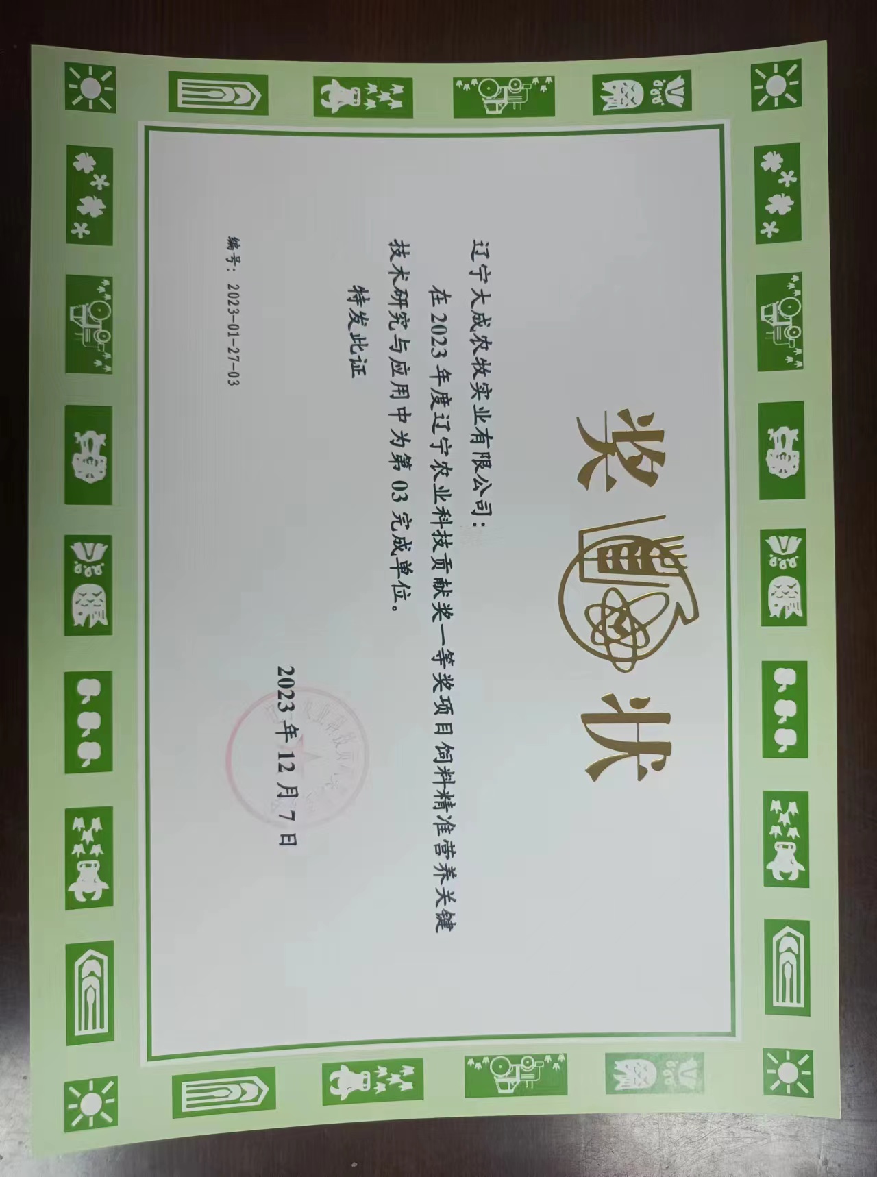 1. 於2017年榮獲遼寧省「飼料工業協會30周年慶典突出貢獻獎」