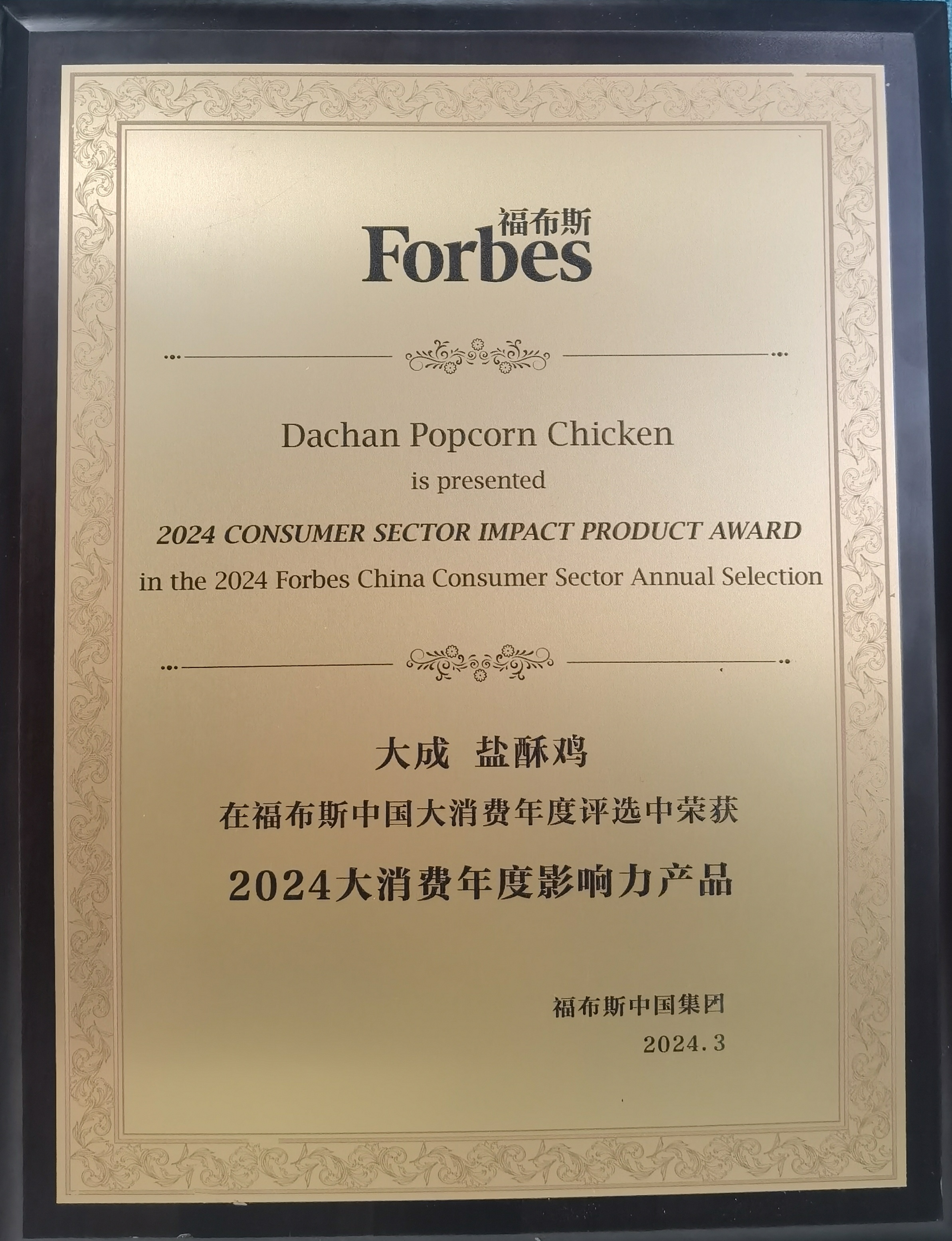 福布斯機構頒發大成鹽酥雞“2024大消費年度影響力產品”