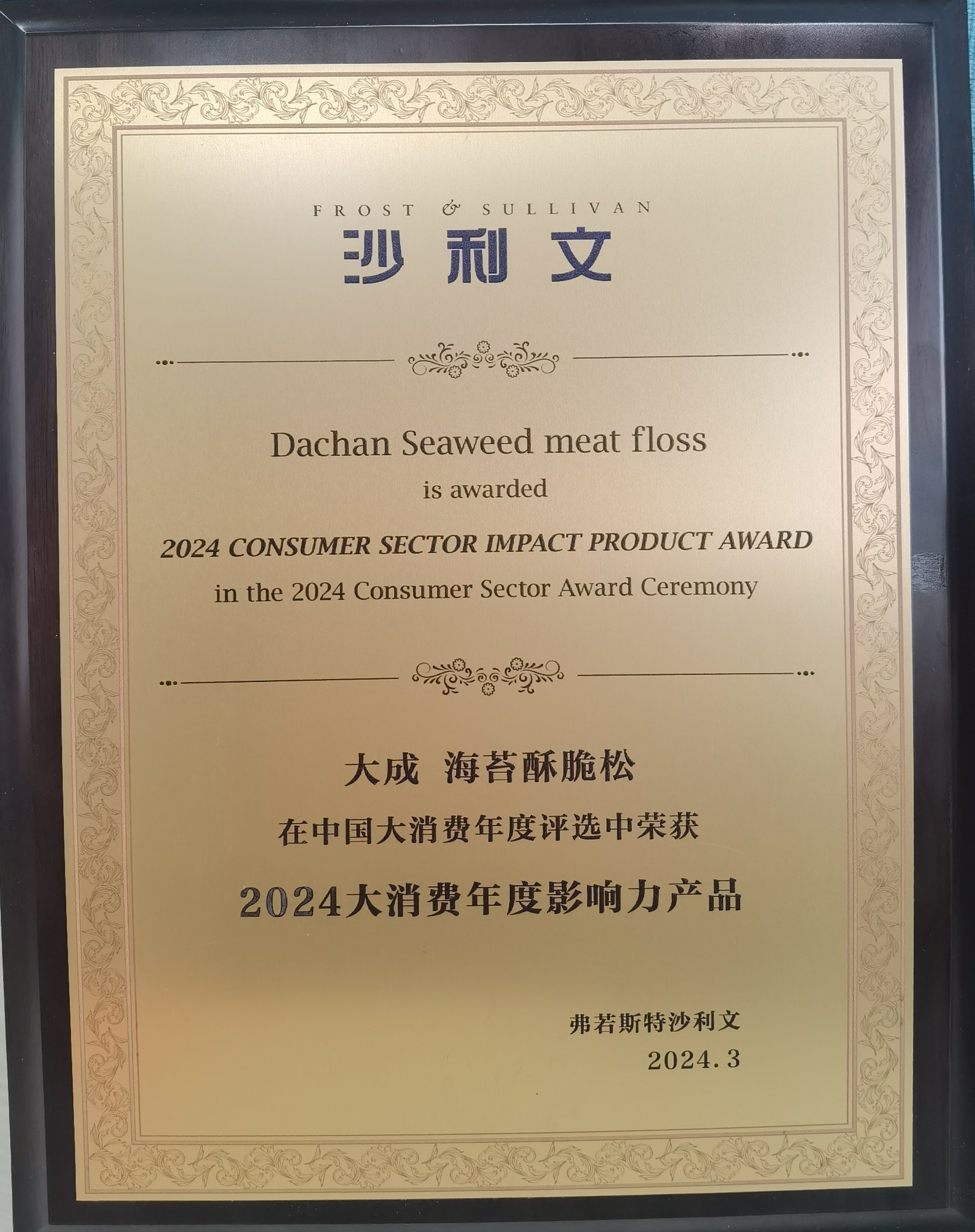 沙利文機構頒發大成海苔酥脆松“2024大消費年度影響力產品”