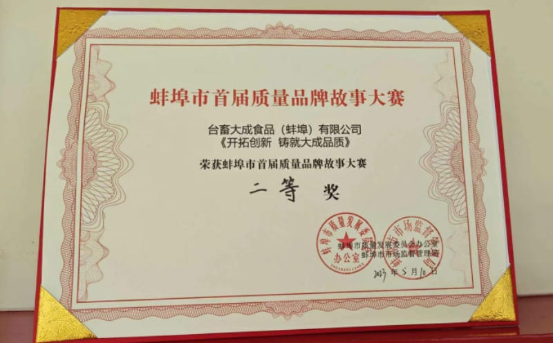 蚌埠市首屆品質品牌故事大賽二等獎證書
