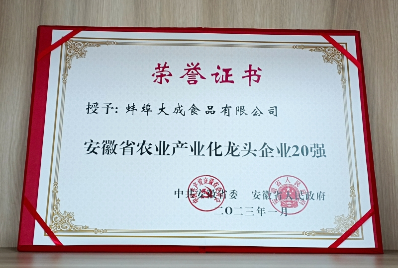 安徽省農業產業化龍頭企業20強證書