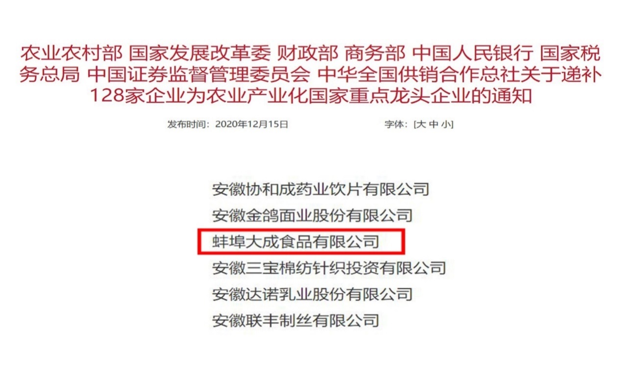 2020年12月15日,農業農村部等8部委發佈《關於遞補128家企業為農業產業化國家重點龍頭企業》的通知,集團旗下“蚌埠大成食品有限公司”被評選為全國重點龍頭企業,是蚌埠市唯一的一家遞補入選的企業,是全國1248家農業產業化國家重點龍頭企業之一,更是全國4000多萬家企業之一。十二年的櫛風沐雨,十二年的厚積薄發,十二年的砥礪前行,蚌埠大成突出重圍!