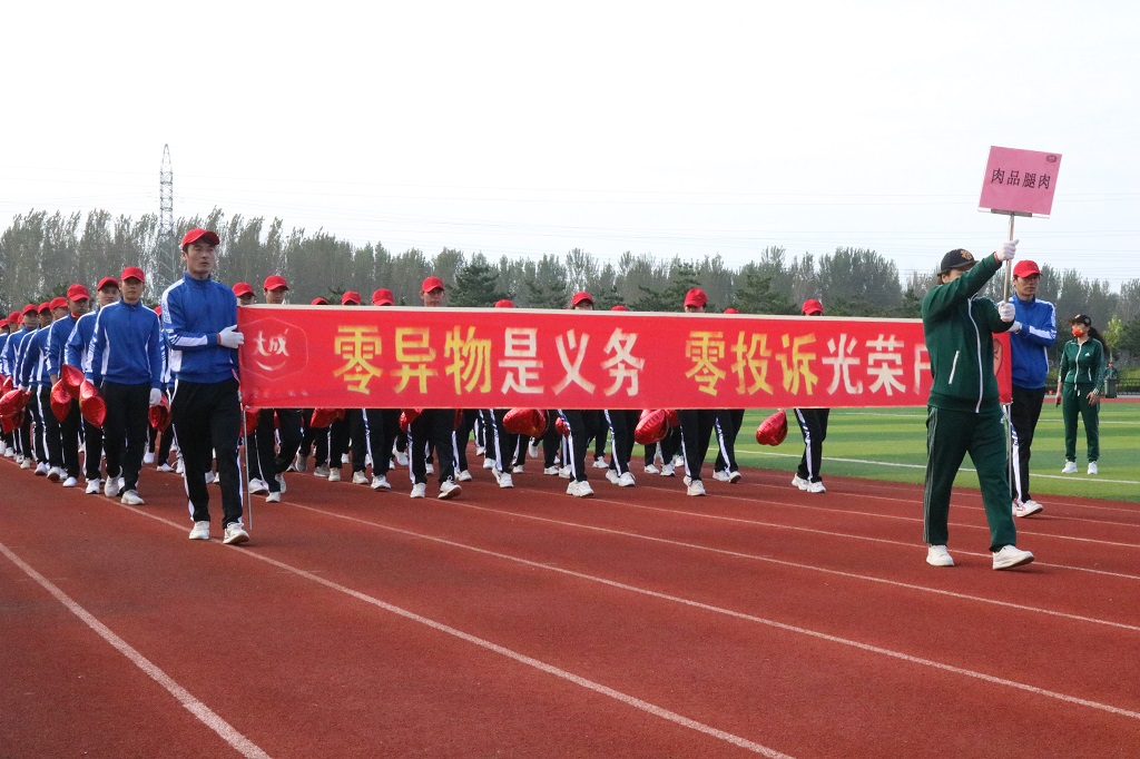 朝陽中,護旗隊手執一面大幅集團旗走來,精神抖擻,鏗鏘有力,它承載了大成人的信念與堅毅。彩旗隊緊隨其後,五彩斑斕,高高飄揚,洋溢著大成人的活力與風采。接下來陸續通過主席臺的是24個員工方隊,朝氣蓬勃、英姿勃發的大成人正迎面走來!飼料團隊、養殖團隊、肉品廠各班組、熟食廠各班組,最後壓軸的是品保團隊和銷售團隊。每支隊伍都身著盛裝、步伐整齊、口號響亮,每支隊伍又各有創意、精彩紛呈,主席臺和看臺上掌聲陣陣、喝彩聲不斷,這是每年運動會上最精彩的華章,也是大成人的熱情宣言!