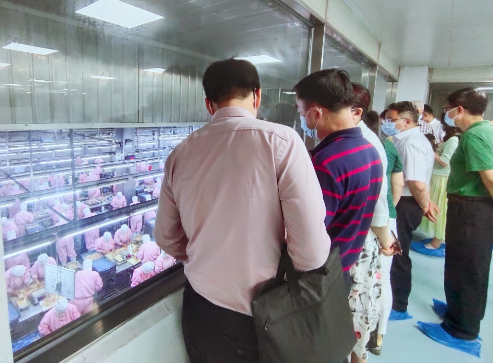 隨後,大成各主管陪同考察團成員來到生產車間走廊,參觀了食品廠生產車間現場,並詳細的介紹了產品的生產流程、生產工藝,以及自動化轉型升級工作等,考察團對食品廠的生產管理工作表示肯定。