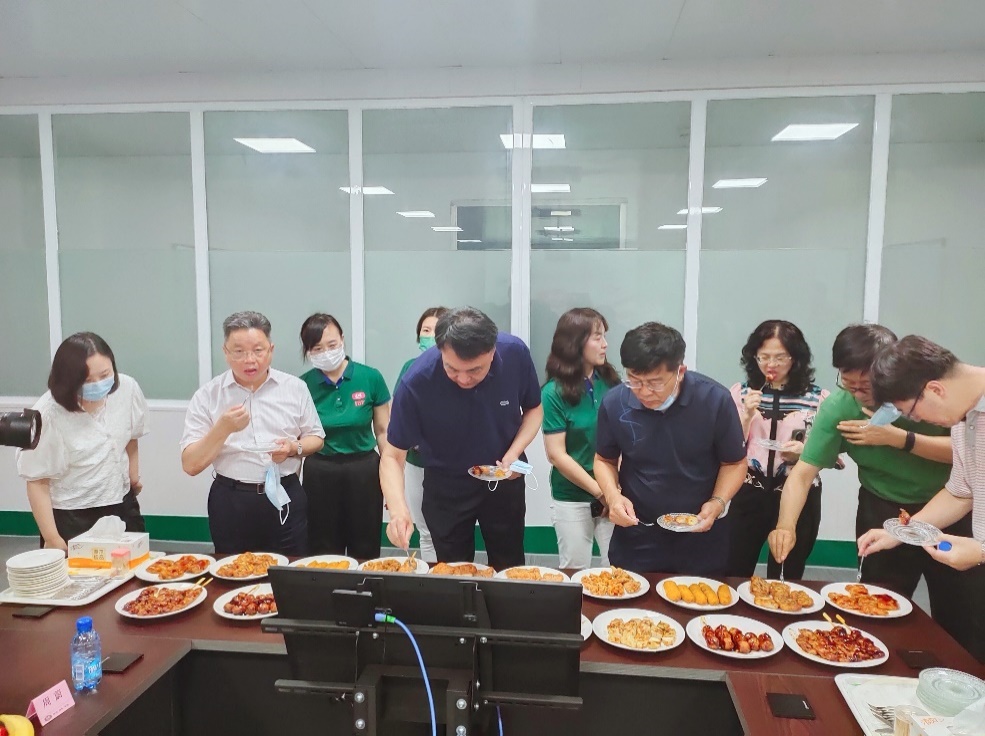在產品品嘗環節,邀請考察團各位成員對食品廠目前熱銷國內外的9種代表產品進行了品評,其中包括長年受日本市場讚譽的碳烤串類產品、唐揚類產品,近兩年獨家自主研發並暢銷的爆款產品照燒脆骨丸串等產品。現場品嘗後,考察團成員對產品從品味、營養、外觀等方面給予了好評並點贊。