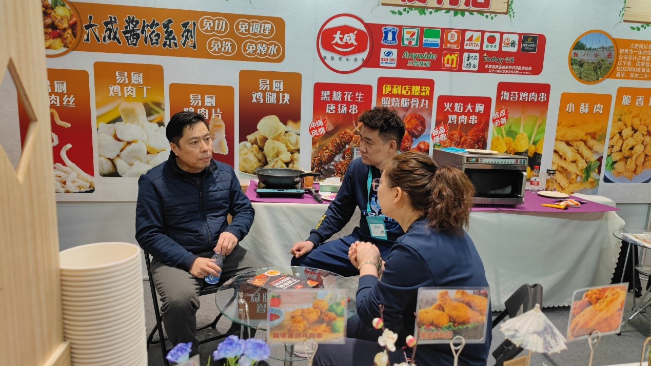 大成食品國際事業之大成食品(大連)有限公司產品展示區品牌主色調與產品相呼應,展示了大成專業的品牌形象。公司經營涵蓋飼料、種雞、孵化、養殖、屠宰、熟食等雞肉食品“一條龍”產業鏈。于本次良之隆展會上首度亮相,吸引眾多客戶及消費者駐足參觀品鑒,針對預製菜系列、便利店系統、以及餐飲定制化等不同場景,分區進行展示,匹配不同客戶。