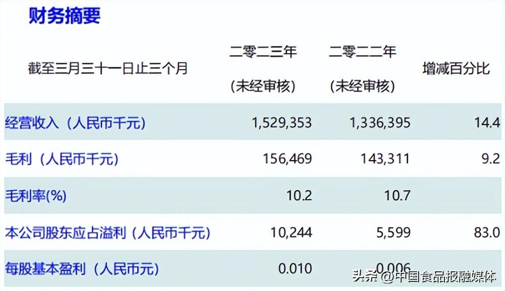 內容摘要:2023 年第一季度,大成食品(亞洲)有限公司業績表現強勁。經營收入達人民幣 1,529,353 千元,同比增長 14.4%;股東應占溢利達人民幣 10,244千元,同比增長約 83%。主要原因是肉品事業營運模式轉型帶來的顯著成效、大客戶開發和精加工業務的持續推動,以及受益於雞肉行情上漲,肉品事業獲利能力顯著提升。此外,食品事業管道策略清晰、執行到位,大客戶與零售管道的快速成長帶動食品事業獲利穩步增長。